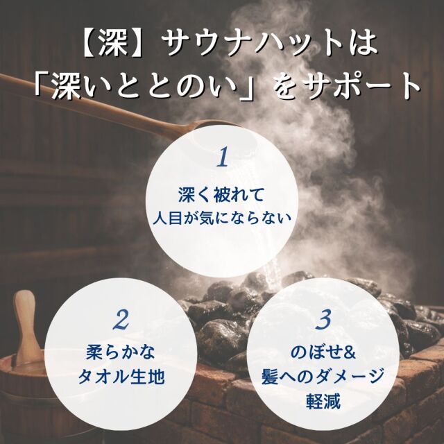 “深く被れて、深くととのう。” サウナの時間を、もう一段上へ。 ALCONオリジナル《深 - SHIN SAUNA HAT》は、 少し大きめ設計(頭まわり約62cm)で、目元までしっかり覆える“深さ”が特長です。 【特徴】 深く被れる安心設計 目元までカバーできるから、 ノーメイクでも気にならない。 周囲の視線をやわらかく遮り、自然と“自分の世界”へ。 ・呼吸がしやすい 口元にゆとりがある設計で、 息苦しさを感じにくい。 熱気の中でもリラックスした呼吸をキープ。 ・集中しやすい 視界がほどよく遮られることで、 余計な情報をカット。 “ととのい”に集中できる環境をつくります。 ・小物ポケット付き ロッカーキーやコインなど、 ちょっとした小物を入れられる便利なポケット付き。 サウナ室への移動もスマートに。 【カラー展開(3色)】 ホワイト – 清潔感と上品さ ネイビー – 落ち着きと安定感 ピンク – やわらかく優しい印象 気分や施設の雰囲気に合わせて選べます。 【 サイズ】 頭まわり:約62cm やや大きめ設計 男女兼用 【こんな方におすすめ】 ・サウナに長く入りたい方 ・ノーメイクで気軽に通いたい方 ・静かに集中したい方 蒸気の中で、静かに深呼吸。 “深く被る”という選択が、 サウナ時間を変えていきます。